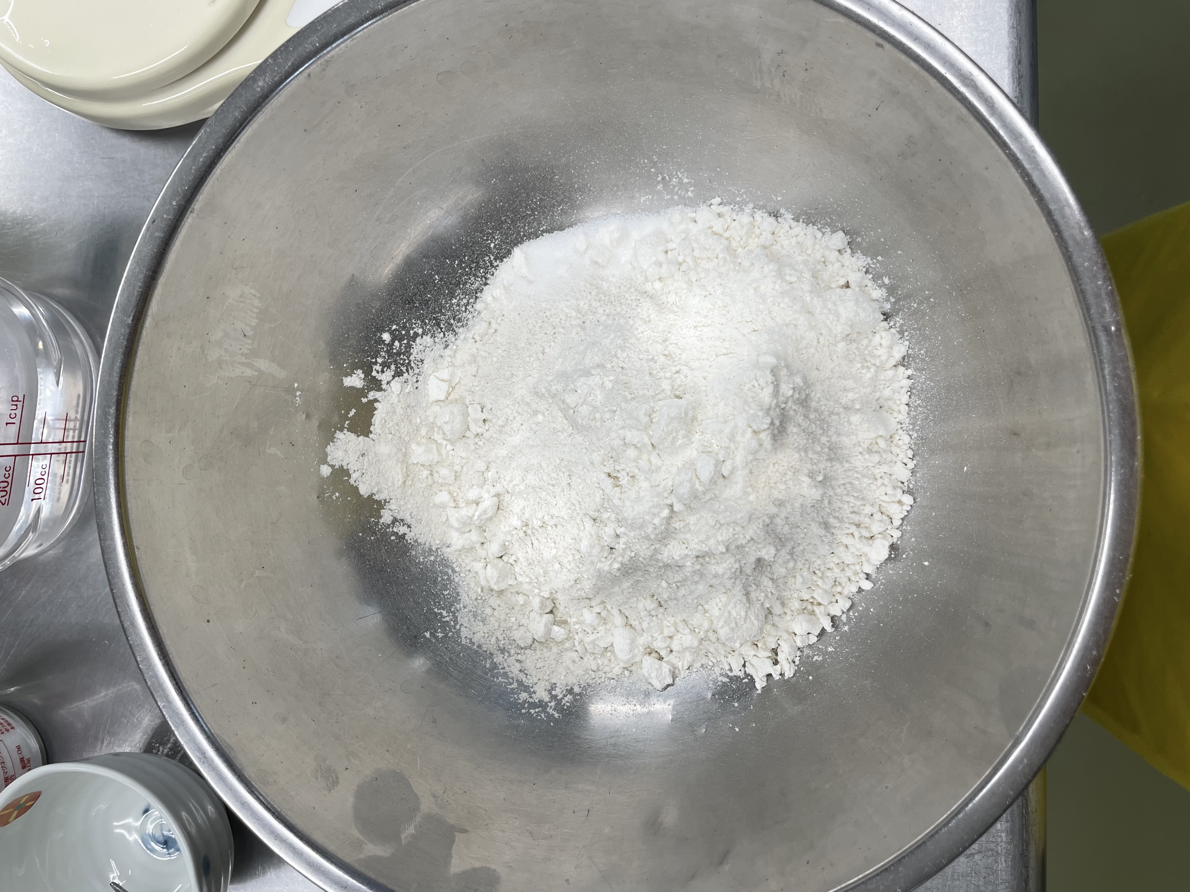 - ①小麦粉、そば粉、塩をボウルに入れて混ぜる。