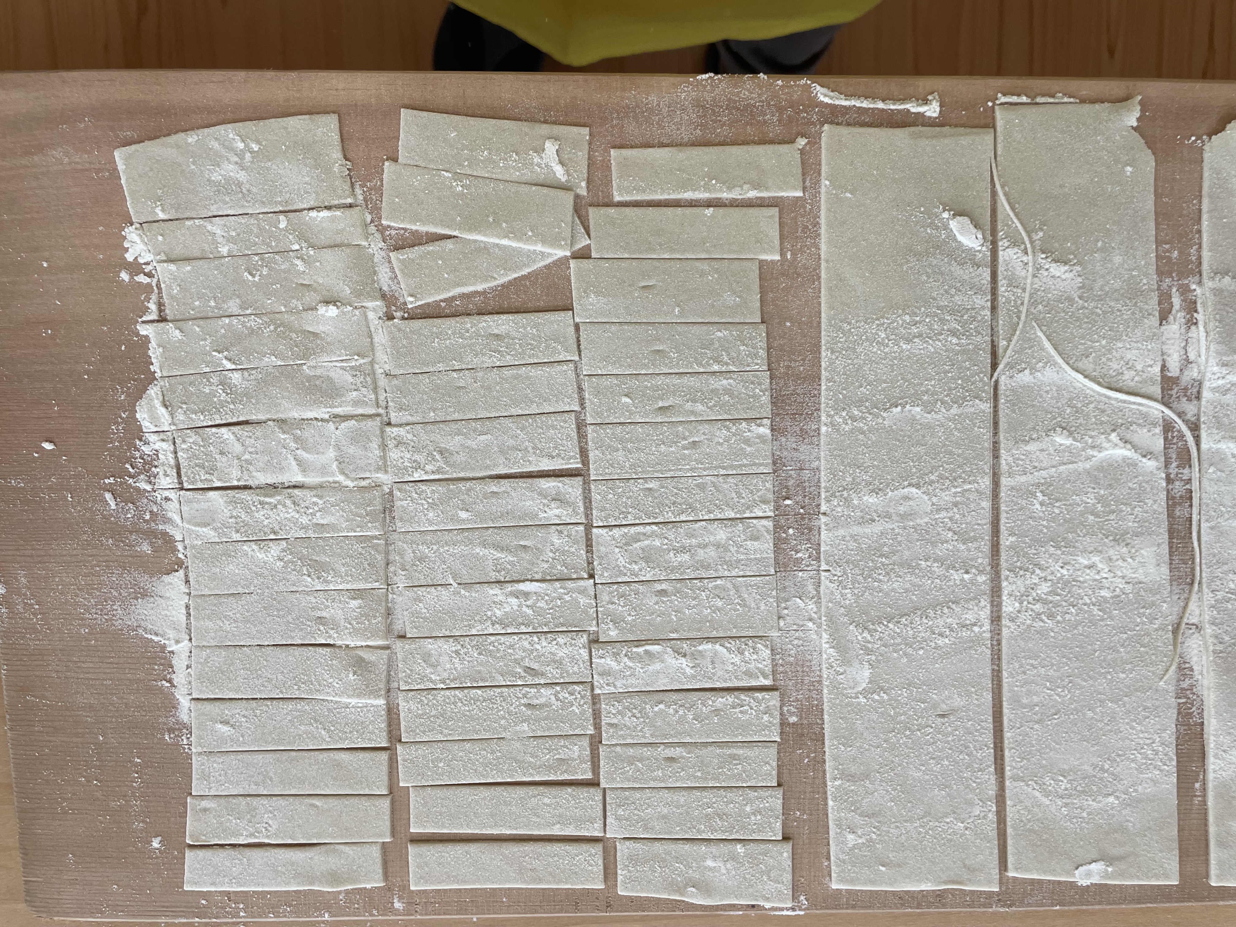 - ⑤打粉をしながら生地を麺棒で均一に伸ばしていく(厚さ1.5mm程度)。